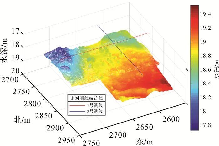 选取本次测量1、2号交叉测线,应用常梯度跟踪模型,经过标准水深处理改正流程获得航迹线、水深如图 4所示,水深范围17.8~19.5 m。