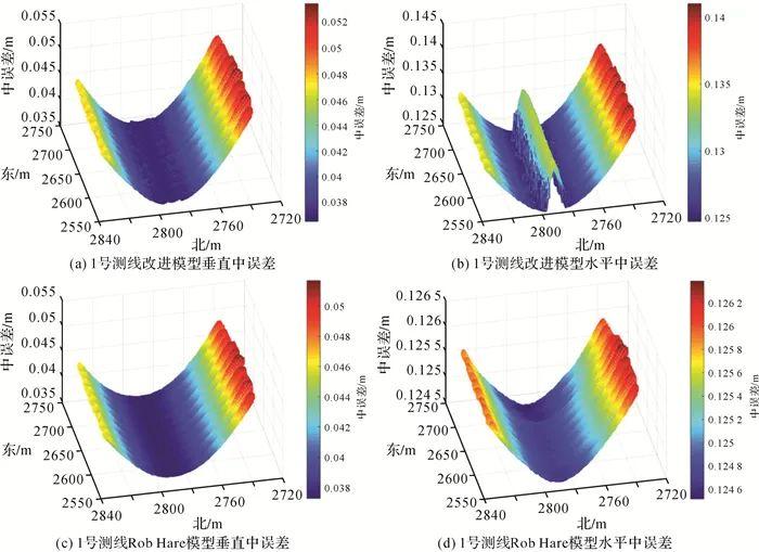图 5 1号测线改进模型和Rob Hare模型垂直、水平方向中误差Fig. 5The vertical and horizontal errors of the improved model of survey line 1 and Rob Hare model