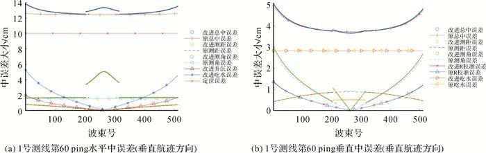 (2) 在垂直方向上,如图 5(a)所示,改进模型误差中央波束小于Rob Hare模型误差,且改进模型分布不规律。原因在于改进模型考虑不同回波检测方式对测深误差的影响规律,中央波束附近采用振幅检测,其波束测距误差引起测深误差小。