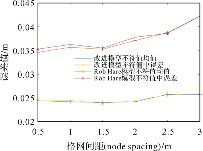 由图 8可知,随着格网间距的缩小,改进模型与Rob Hare模型不符值中误差呈现减小趋势,说明两模型均能提高数据质量,其中改进模型不符值中误差下降幅度较Rob Hare模型更快, 在格网间距为0.5 m时减弱了约2%中误差,以上表明,改进模型对数据中偶然误差的刻画更为详尽且符合真实情况,验证了改进模型误差组成更完善的优势。