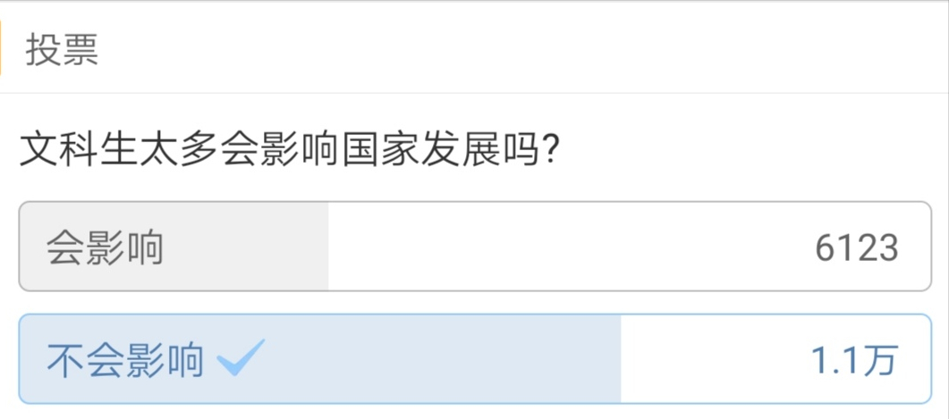 近段时间,在网络上看到这样一则新闻。“文科生太多会影响国家发展吗?”甚至,还有人在这个话题下直接进行了投票活动。据投票显示,其中选择不会影响的人在6000多人,而选择不会影响的人在1.1万人。