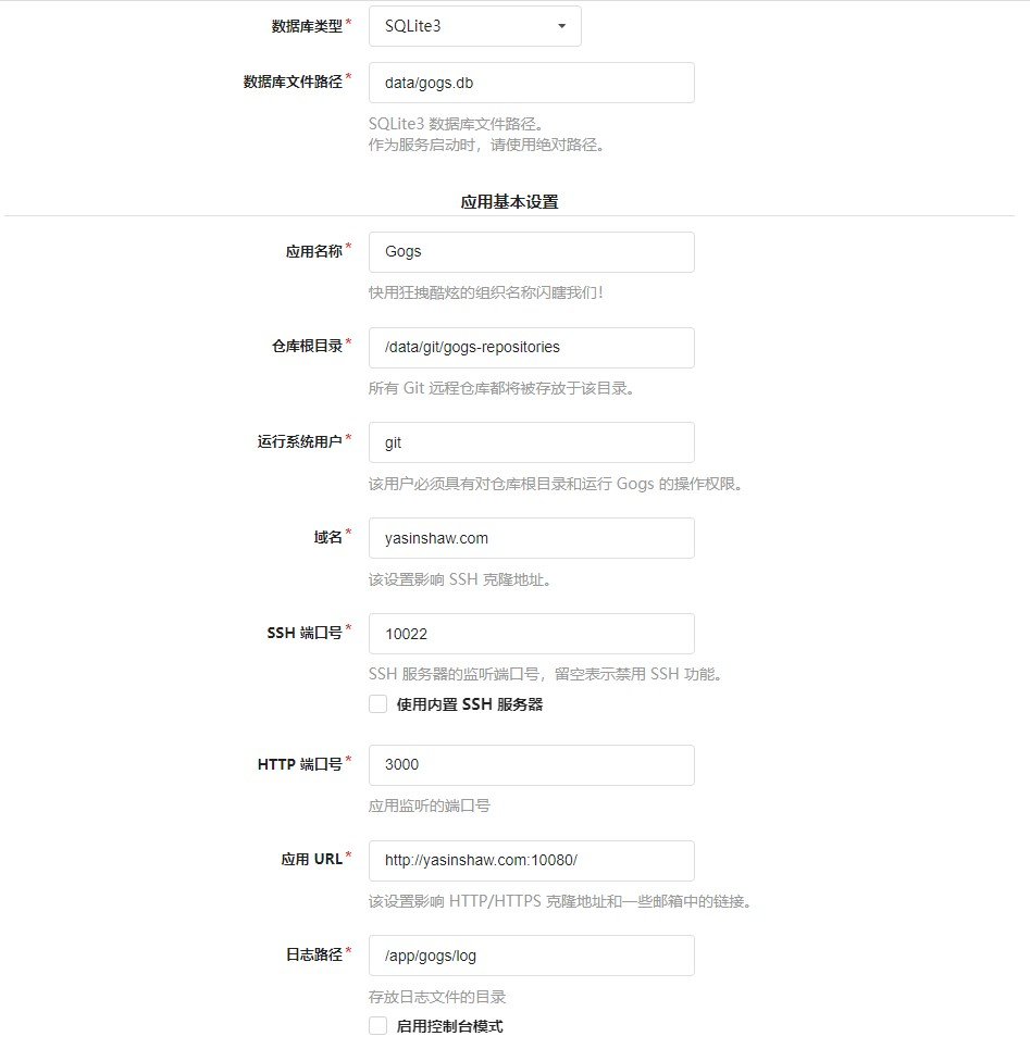 sudo docker run -d \--name=gogs --restart=always \-p 10022:22 -p 10080:3000 \gogs/gogs启动后,在浏览器访问服务器的10080端口,就可以打开gogs了,第一次打开需要进行初始化设置,这里注意端口和url的设置: