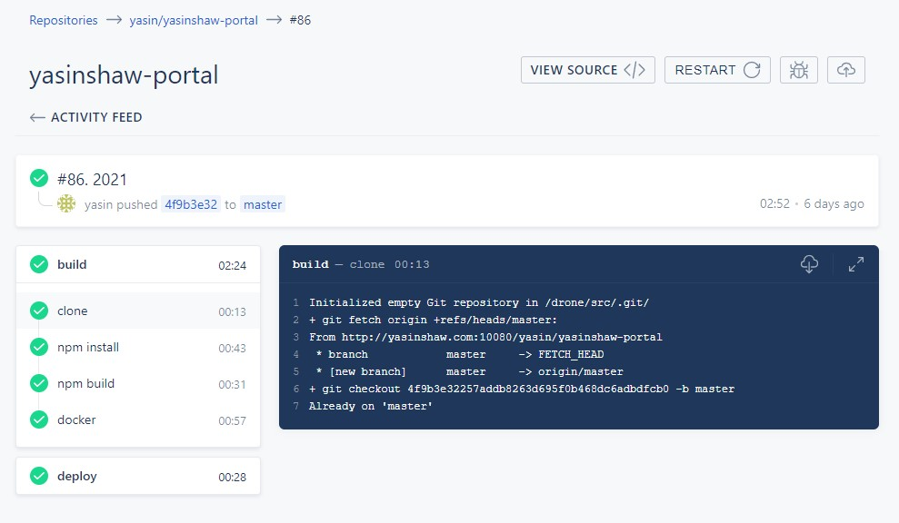 kind: pipelinename: buildsteps: - name: npm install image: node:12-buster-slim commands: - npm install -g cnpm --registry=https://registry.npm.taobao.org - cnpm install - cnpm i @nuxtjs/axios - cnpm i @nuxtjs/toast - cnpm i @nuxtjs/proxy - name: npm build image: node:12-buster-slim commands: - npm run build - name: docker image: plugins/docker settings: username: yasinshaw password: from_secret: docker_password repo: registry.cn-hangzhou.aliyuncs.com/yasinshaw/yasinshaw-portal registry: registry.cn-hangzhou.aliyuncs.com mirror: https://mzayqkhl.mirror.aliyuncs.com tags: latest---kind: pipelinetype: sshname: deployserver: host: yasinshaw.com user: root ssh_key: from_secret: ssh_keysteps: - name: pull image environment: DOCKER_PASSWORD: from_secret: docker_password commands: - docker login --username=yasinshaw --password=$DOCKER_PASSWORD registry.cn-hangzhou.aliyuncs.com - docker pull registry.cn-hangzhou.aliyuncs.com/yasinshaw/yasinshaw-portal:latest - name: remove old container failure: ignore commands: - docker rm -f -v portal - name: start container commands: - docker run -d --name=portal --restart=always -p 3000:3000 registry.cn-hangzhou.aliyuncs.com/yasinshaw/yasinshaw-portal:latestdepends_on: - build这里的secret需要去drone的界面上配置。secret的具体用法可以参考官方文档:https://docs.drone.io/secret/