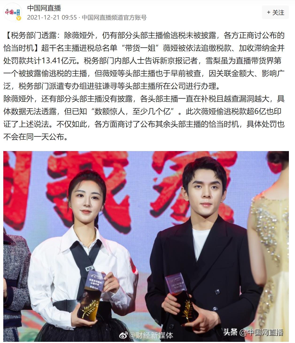 12月20日,税务部门公布薇娅在 2019-2020年期间偷逃税6.43亿,其他少缴税0.6亿,被罚补缴共计13.41亿