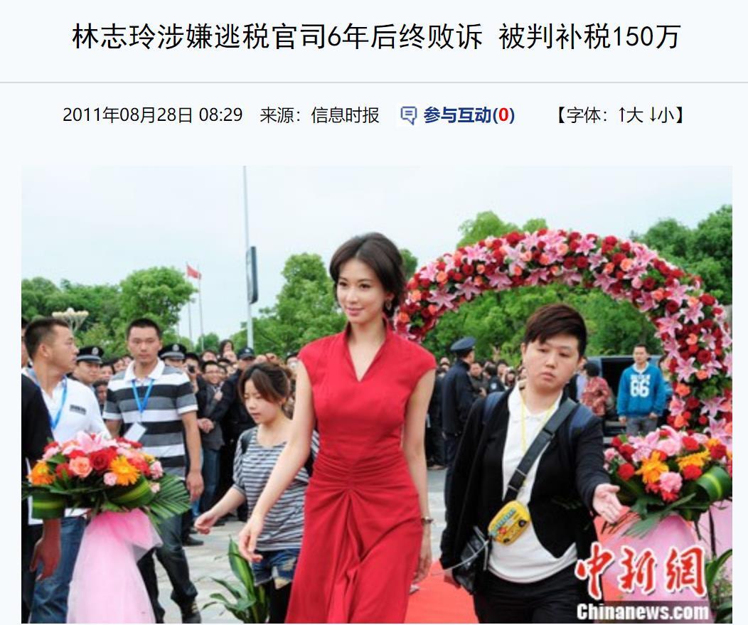 2011年,林志玲涉嫌逃税官司6年后败诉,1992-1994年偷漏个人综合所得税,最后被台北法院判补缴684万新台币(折合人民币150万元)。