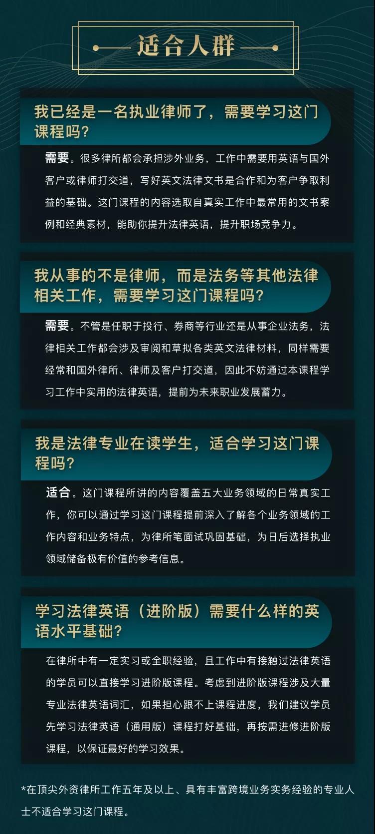 为了帮助法律从业者有效率地提高业务能力,职问把顶尖律所律师必备的业务知识与法律英语结合,研发出职问法律英语(进阶版)课程。
