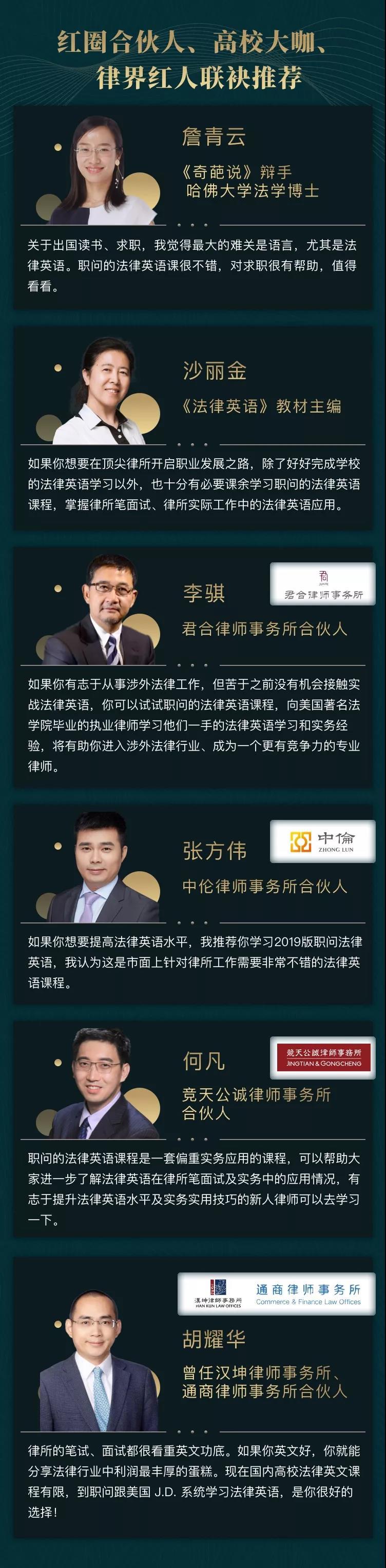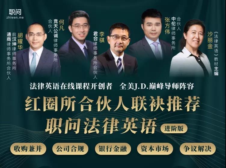 取材自最新法律文件及法律规定,只讲实务中真正用得上的法律英语,同步提高业务能力和法律英语水平;分为收购兼并、资本市场、争议解决、银行金融、公司合规等5门课程,自由组合,个性化学习;五位毕业于美国 Top 法学院 J.D. 、就职于顶尖律所的导师分别讲解他们最擅长的律师实务;各领域分别涵盖300+分钟音频课程,便于工作学习繁忙的学员随时利用碎片化时间学习提升。各领域课程涵盖相关英文法律文书重点条款的撰写逻辑、文书的作用和结构以及格式要求、常用的英文词汇和表达,介绍背景知识和业务实操 Tips。职问法律英语已经售卖超过7000份,获得了多位红圈所合伙人、高校学术大咖、律界红人的认可和推荐: