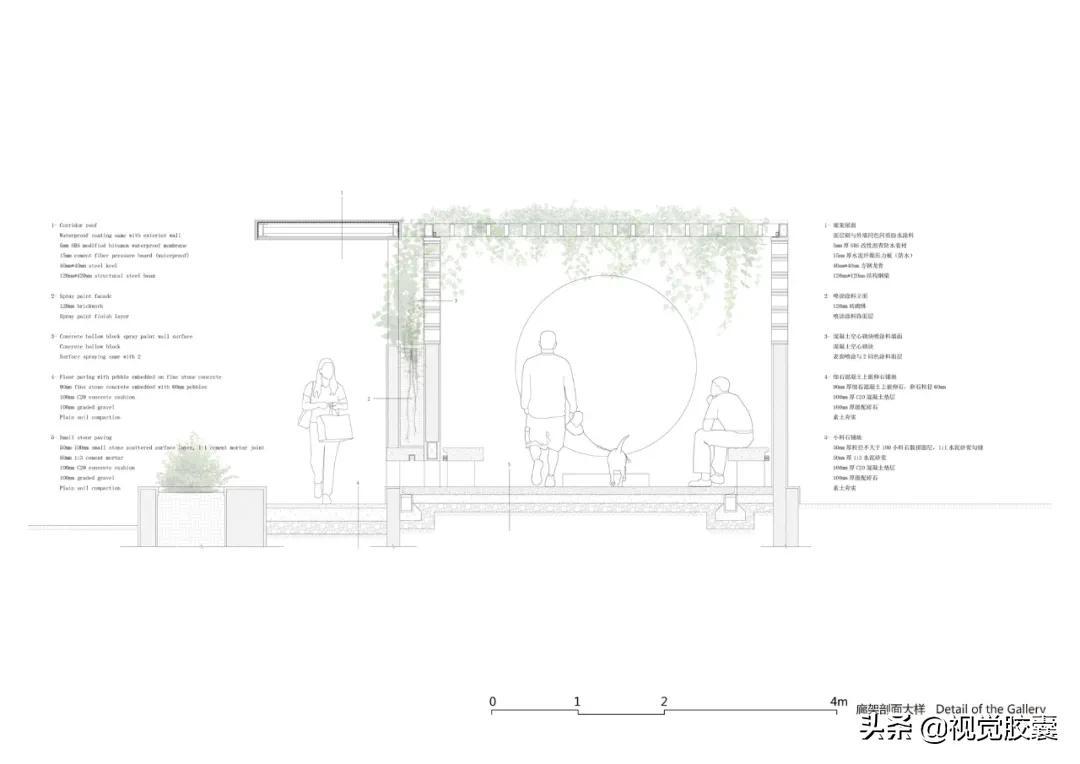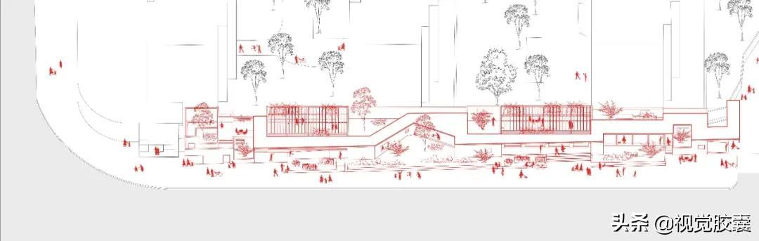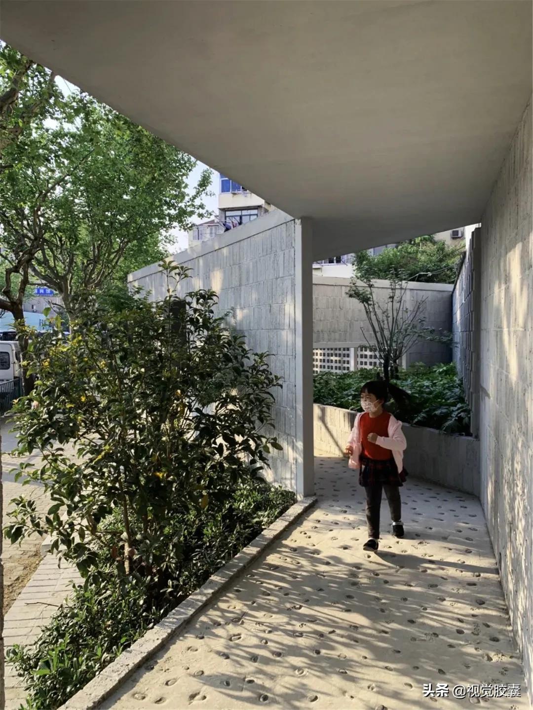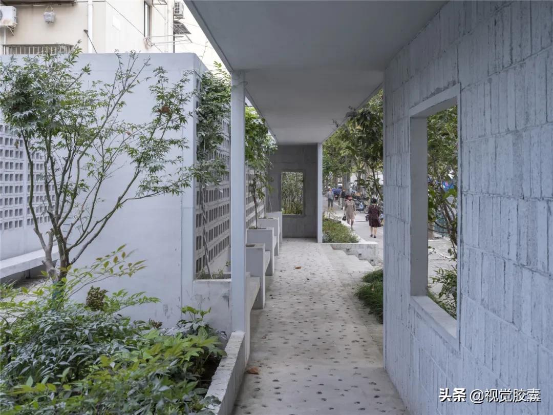 游廊的曲折错动对应着因地布局的场所节点:它们有些是买菜回家的居民的休息敞廊,有些作为小区入口的缓冲地带,有些是提供给放学儿童的读书庭院,有些则成为老年人相聚聊天的街头会客厅。