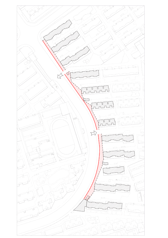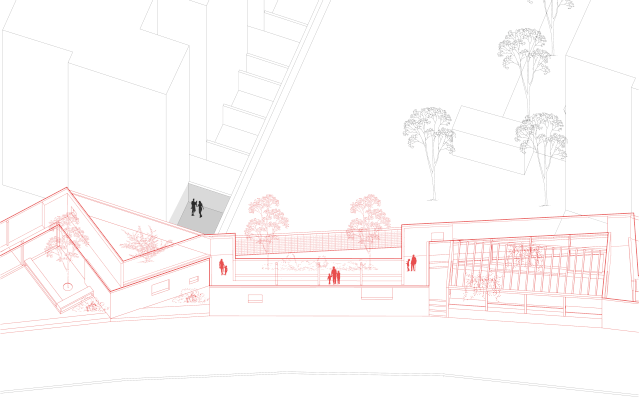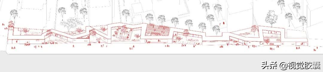 △ 方案生成动图:由于沿街店面的拆除留下内外侧双重界面,重新构想的曲折界线将场地与内部社区、外部街道的空间结合起来,根据场地的特定条件进一步调整的界线现状,并由此发展成为一条行走路线。 ©梓耘斋建筑