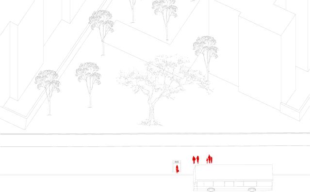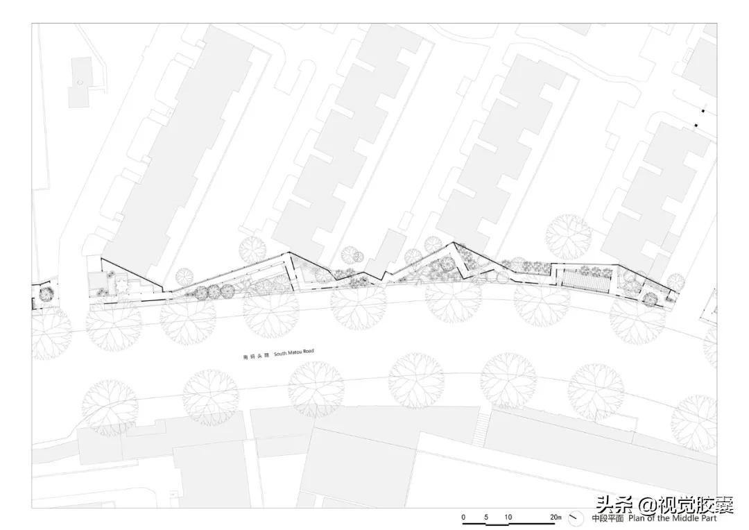 改造设计首先确立了折线型的游园路径。根据沿街住宅楼的排列方式,围墙内外的树木环境和街道功能,游廊的走向相应地内外凹凸,不仅与小区内部的环境形成呼应、扩展视野,同时也在为街道提供拓展性的口袋空间。这样每一处的段落空间在获得功能性价值的同时,也使小区内外的环境交织起来,无形中消解了围墙带来的隔断感,使这道围墙园林成为内部社区居民、外部街道游客都能获得参与感的中心性场所空间。