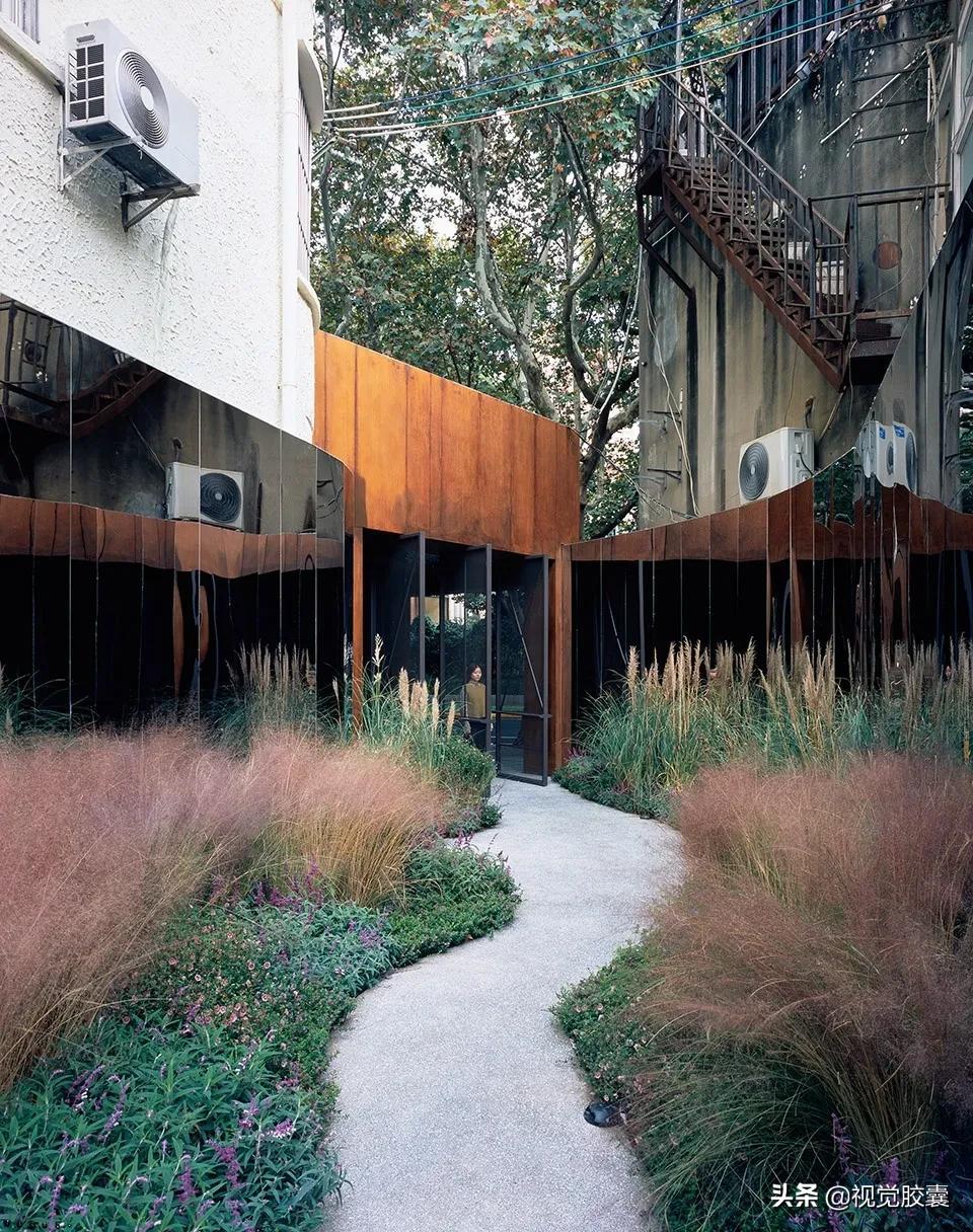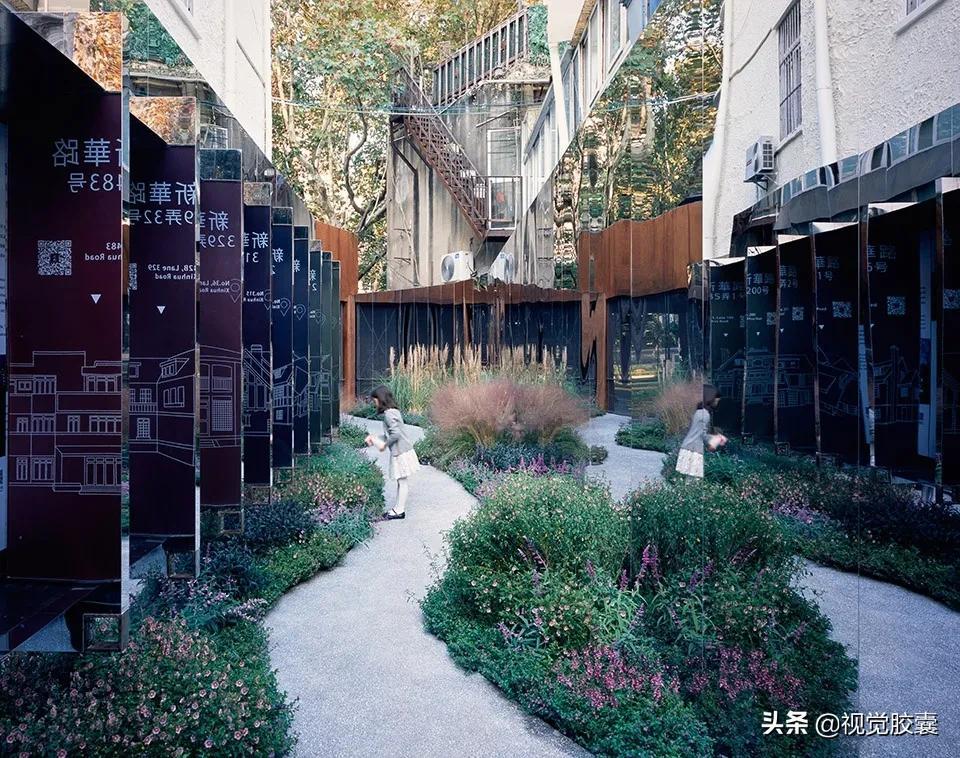 首先,在内部弄堂两侧墙面上设置了镜面不锈钢系统,这是整个设计的核心。两边的镜面系统将无限反射中间的小花园,当人从中走过,仿佛步入一个无限的自然花园,从而带来一种在城市中很难得的体验。