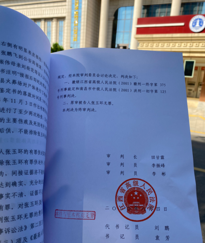 2020年7月9日,张玉环重新站上法庭被告席,同年8月4日,江西省最高人民法院对案件作出判决——“原审被告人张玉环无罪。”