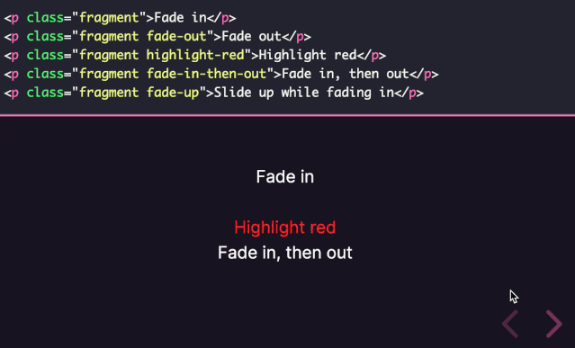 data-background-image 当前页的背景图片地址data-background-size 背景的大小data-background-position 背景位置data-background-repeat 背景的重复方式data-background-opacity 背景透明度data-background-video 视频背景的地址data-background-video-loop 视频背景的循环模式data-background-iframe 背景为iframe的url地址data-background-interactive 是否能与iframe的内容交互Fragments用来高亮或者渐进式的展现元素.每一个包含fragment类名的元素都被视为渐进的元素, 它们会通过点击下一步来依次呈现在幻灯片中.