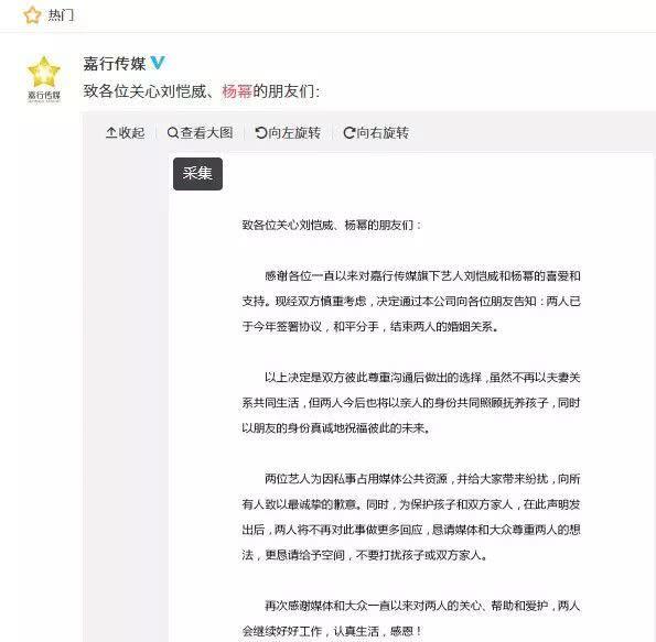 杨幂离婚的传闻已经由来已久。2015年,嘉行传媒借壳西安同大,登上新三板。隔年,便有消息爆出,此前券商对嘉行传媒进行尽职调查,已经了解到杨幂、刘恺威二人离婚的消息。
