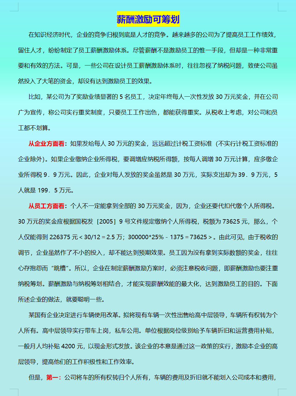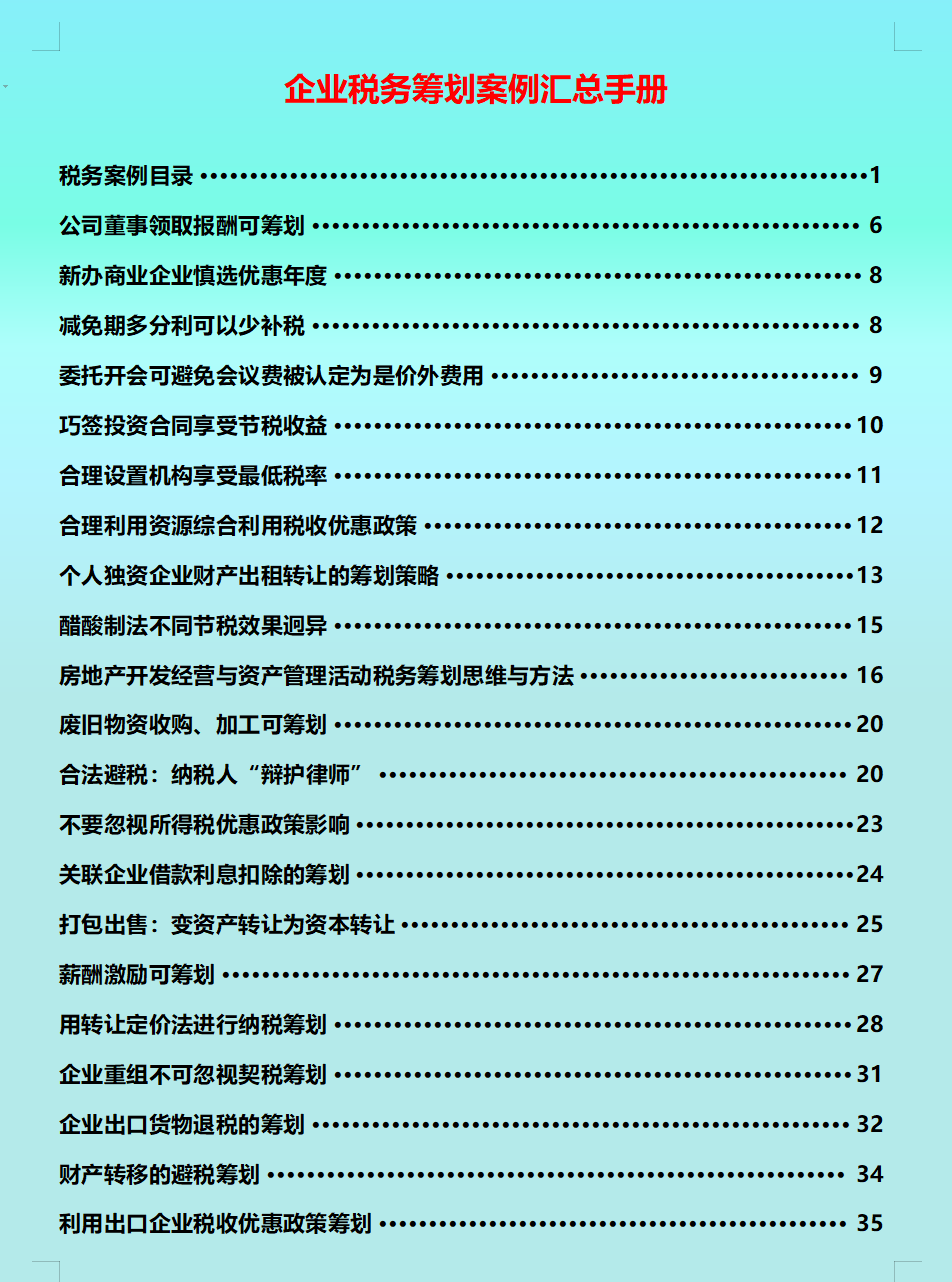 为了能够提高我们财务部门整体的税务筹划能力,我们财务经理把他工作十年的经验总结出了一套企业税务筹划案例汇总手册,看完之后我们是真心佩服!