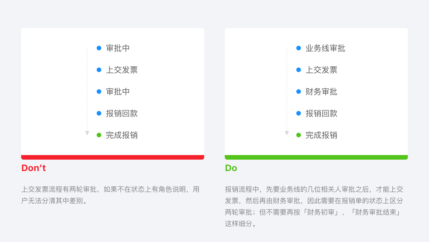 同一阶段时,不建议区分不同用户角色看到的状态名,可以给他们不同的反馈或提醒。