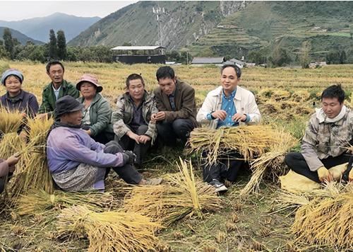 佛山驻喜德工作组组长,喜德县委常委、副县长黄礼泉(右二)与老百姓田头谈收割。