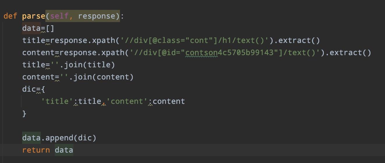 我们要保存数据就需要parse模块有返回值,我们先新建一个空列表data,然后我们将title和content放入字典中并添加到列表中