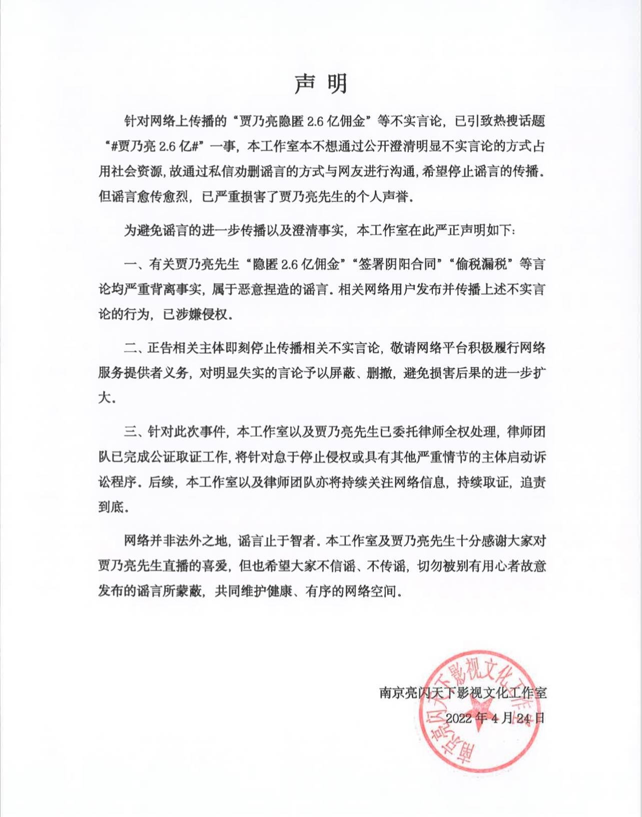 贾乃亮工作室发文表示,网上所传的贾乃亮在直播中与商家签订阴阳合同,隐匿佣金高达2.6亿等消息,是假消息。