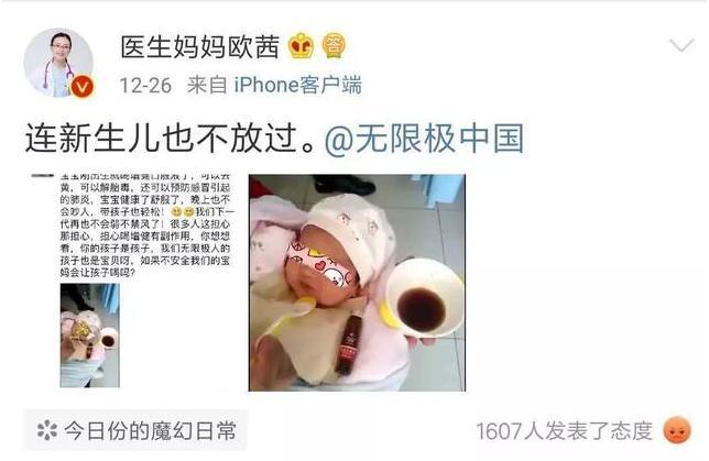 据时间财经报道,2018年12月26日,一位在微博上被认证为儿科医生大V的博主“医生妈妈欧茜”发文称:“连新生儿也不放过”。配图疑似为欧茜截下的无限极销售人员的朋友圈信息:“宝宝刚出生就可以喝增建口服液了,可以去黄,可以解胎毒,还可以预防感冒引起的肺炎……我们无限极人的孩子也是宝贝啊,如果不安全我们的宝妈会让孩子喝吗?”