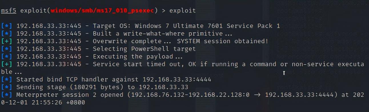 对target3进行攻击,发现有ms17_010_psexec漏洞,直接进行漏洞利用