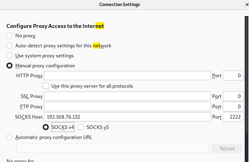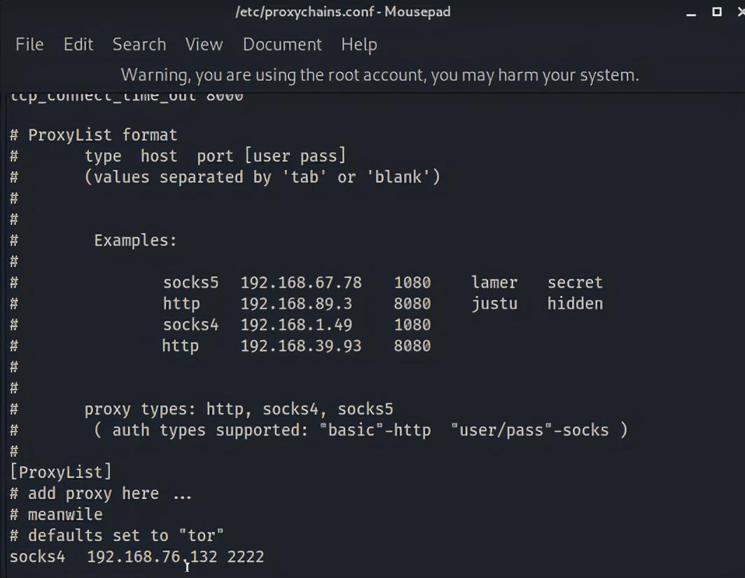 利用ProxyChains代理工具设置代理服务器修改配置文件 /etc/proxychains.conf 添加 socks4 192.168.76.132 2222