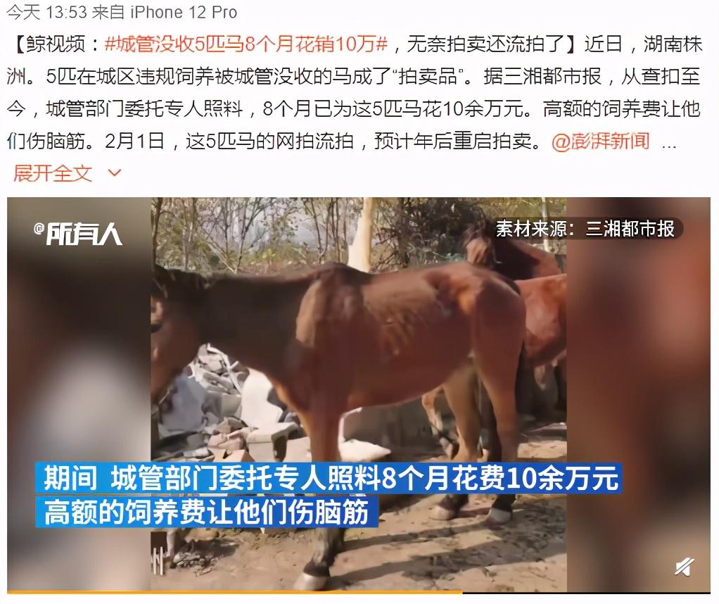 最新消息是,湖南株洲城管没收5匹马,8个月为这些马花费10万余元,养不起了,也要进行司法拍卖......