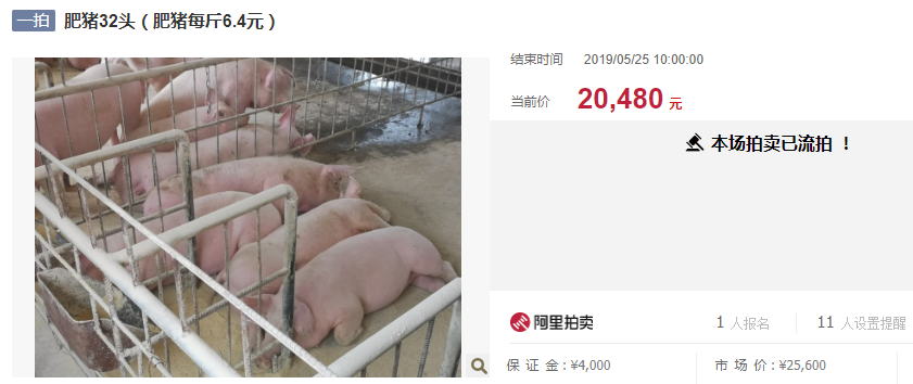 肥猪32头,起拍价2.048万元,每斤6.4元,无人参与竞拍;