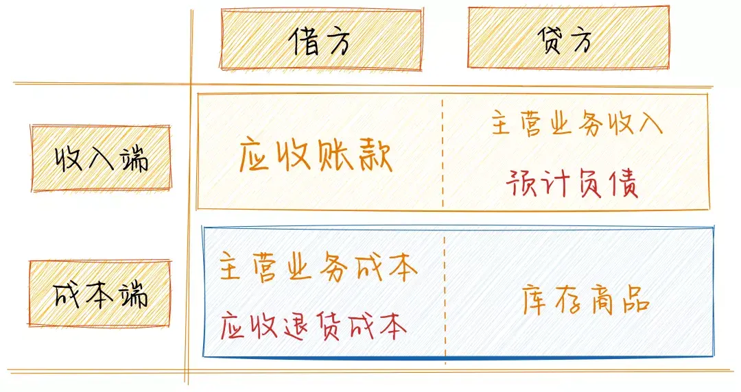 具体的会计处理,会涉及到下图方框内的两组分录,其中“应收退货成本”是本章节的新增科目,其本质还是一项存货,属于资产类科目。
