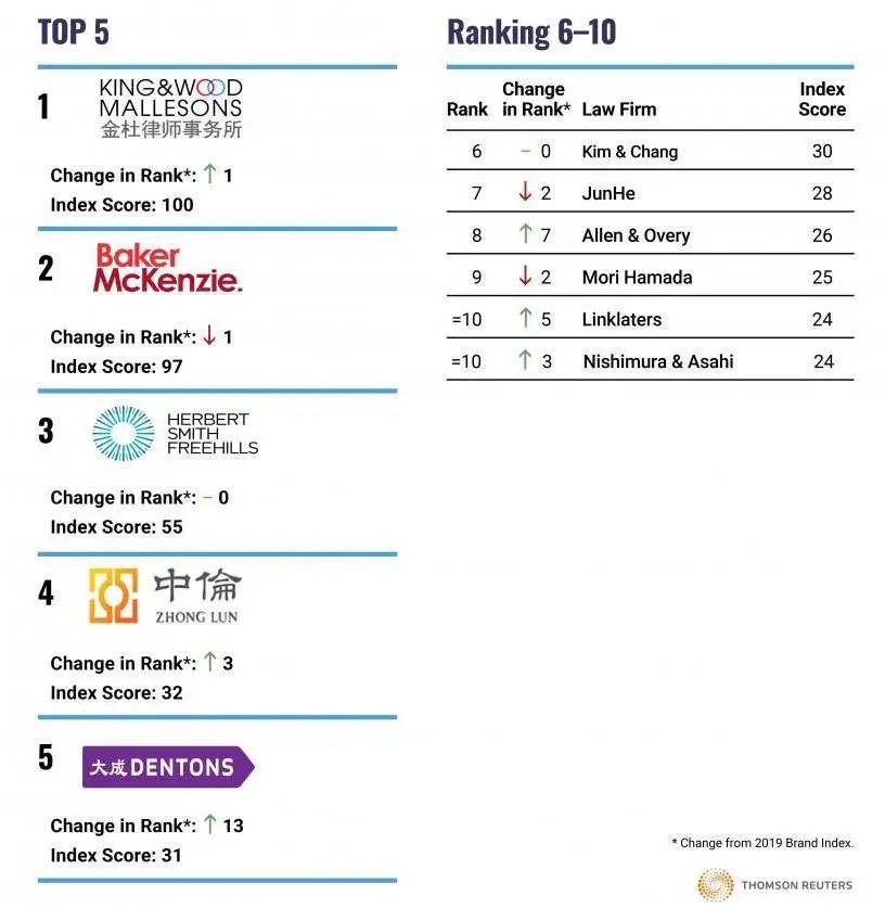 近日,汤森路透旗下法律服务市场研究机构Acritas公布了2020年亚太律师事务所品牌指数榜单(Acritas Asia Pacific Law Firm Brand Index),榜单中列出了亚太地区品牌价值排名前10的律师事务所。