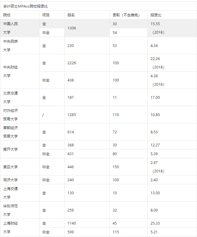 因为会计专业人数的原因报考MPAcc的人数也是称直线上升,2018年2019年均突破10万人,而报考MPAcc①对于专业没有要求。②初试科目简单。所以导致非本专业人也存在报考的情况这也使得竞争异常激烈,全国各报录比平均为11.25左右。