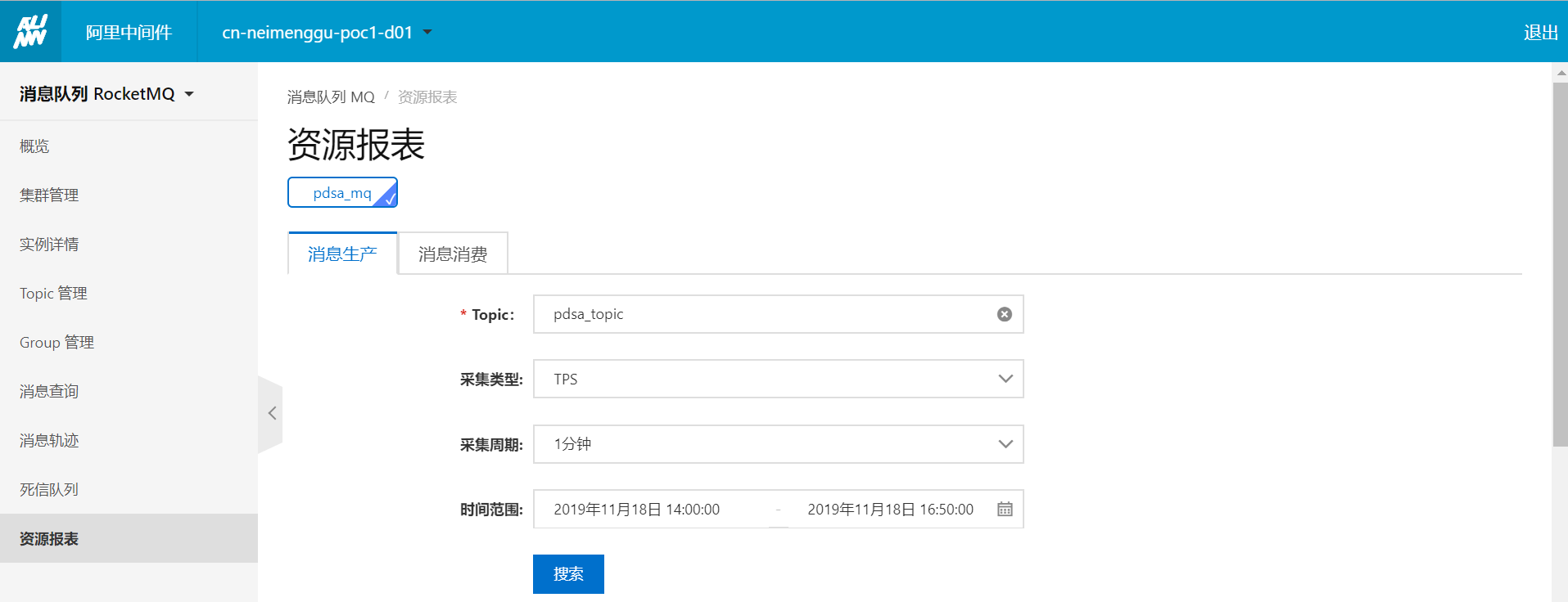 1.登录MQ控制台。2.在左侧导航栏,单击资源报表。3.在资源报表页面,单击消息生产页签。4.在Topic一栏,选择Topic,并指定其他信息,然后单击搜索。字段说明:
