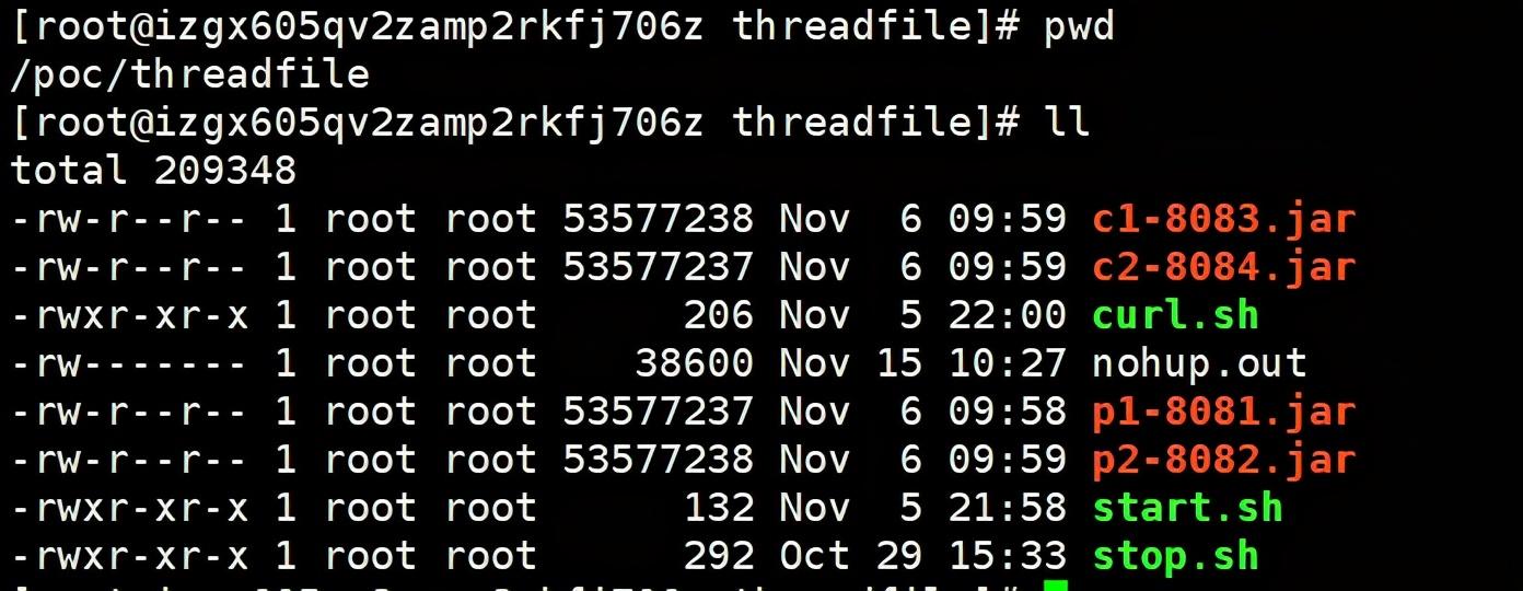 3.同时在该目录下编写启动4个jar包的start.sh脚本:#!/bin/bashnohup java -jar p1-8081.jar &nohup java -jar p2-8081.jar &nohup java -jar c1-8081.jar &nohup java -jar c2-8081.jar &4.编写停用4个jar包的stop.sh脚本: