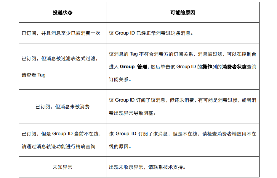 投递状态是消息队列 RocketMQ 版根据各个 Group ID 的消费进度计算出的结果,投递状态的信息如下表所示。