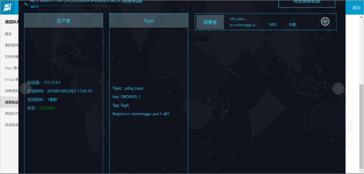 4.在操作栏中单击消息详情,可查看到轨迹的简要信息,主要是消息本身的属性以及接收状态的信息。