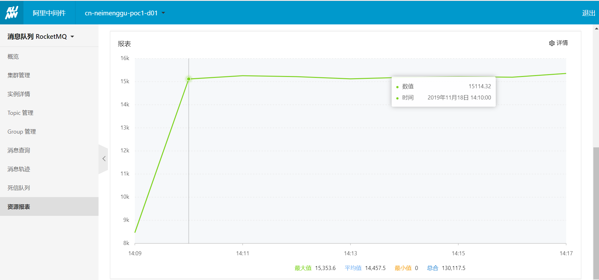 采集类型:分为总量和TPS。总量提供每个周期内该Topic投递给该Group ID的消息总量,TPS提供每个周期内该Topic投递给该Group ID消息的平均TPS。采集周期:包括1分钟、10分钟后、30分钟、1小时。采集周期决定了数据采集的时间间隔,周期越短,采集点越密集,消息消费数据越详细。时间范围:RocketMQ最多可以提供最近三天之内的消息的消费查询。查询结果以图表的形式显示