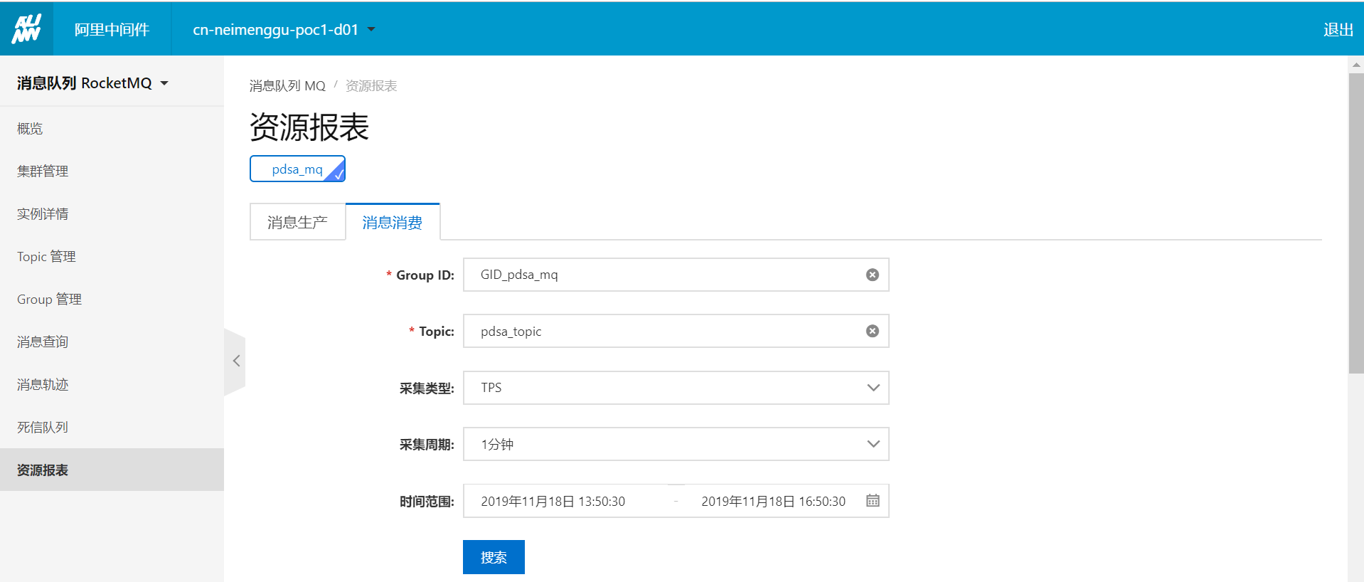 1.登录MQ控制台。2.在左侧导航栏,单击资源报表。3.在资源报表页面,单击消息消费页签。4.在Group ID和Topic栏,分别选择您要查询的Group ID和Topic。5.指定其他信息,然后单击搜索。字段说明: