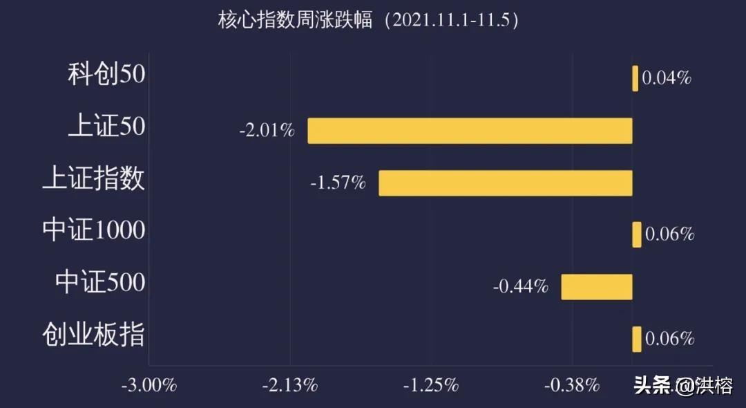 11月第一周,沪指涨幅-1.57%,成交额25534亿元,深成指涨幅+0.08%,成交额31580亿元,创业板指涨幅+0.06%,成交额12274亿元,科创50涨幅+0.04%,成交额2489亿元。
