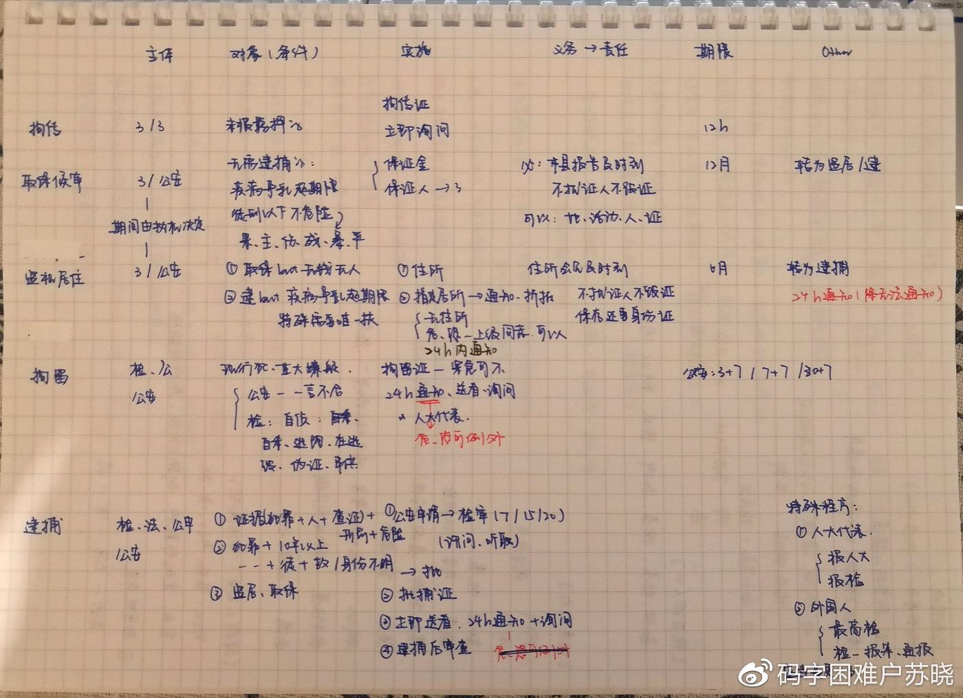 ②各种时间和数字非常难记,我也会把它们单独整理出来,比如刑诉各种强制措施的期限、各个环节的期限。