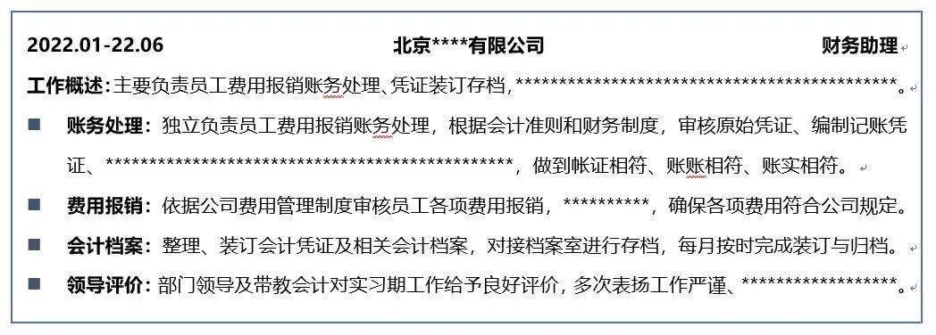 注意:财务相关岗位尤其是实习期间的有些工作较难量化,可以用描述性语言表达结果;在罗列的重点关键词中可以增加“领导评价”一项,可以总结性的把领导或者带教前辈的评语写出来,以表达出业绩或者职业素质。