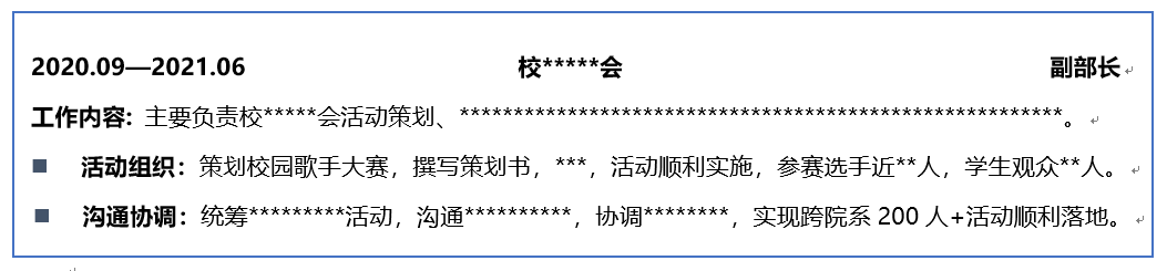 在校经历通常会写学生会、社团、参与的项目等经历,因为学校的工作场景及内容有些与职场中并不相同,所展示的重点围绕着可迁移能力、素质。