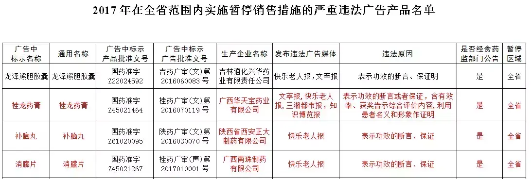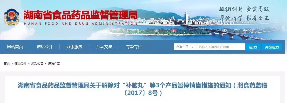 2017年7月,湖南、辽宁食药监局相继发布查处通知。其中,湖南省食药监在《关于在全省范围内暂停销售归元健脑片等10个严重违法广告产品的通知》中提到,2017年以来,“归元健脑片”等10个药品、保健食品产品在湖南省媒体发布的广告中多次存在严重违法宣传行为,造成恶劣影响。