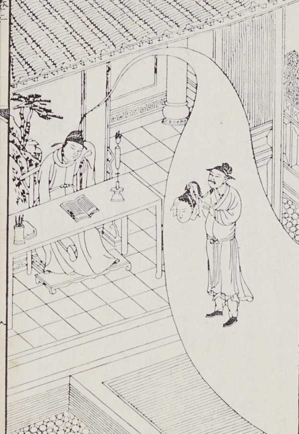 明代正统十年乙丑科状元商辂,在考试之前梦见一个人提着三颗头颅。一般人或许会将其当成恐怖噩梦,但事实上,它却预兆吉祥,头即“首”,又被称为“元”,提着三颗头,是“连中三元”之意。插图出自万历刻本《状元图考》。