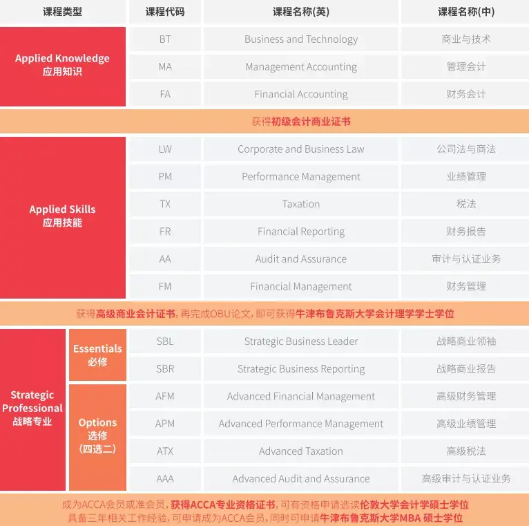 ACCA的科目分为两个阶段:基础阶段和专业阶段。四个课程:知识课程、技能课程、职业核心课程、职业选修(四选二)课程,共15门科目(需通过其中13门)。