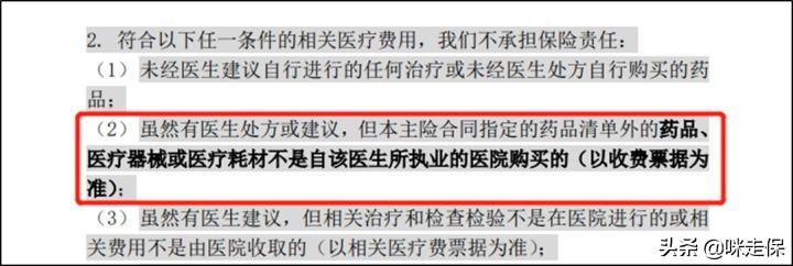 像这个免责条款,也是直接把外购药的报销给拒之门外了: