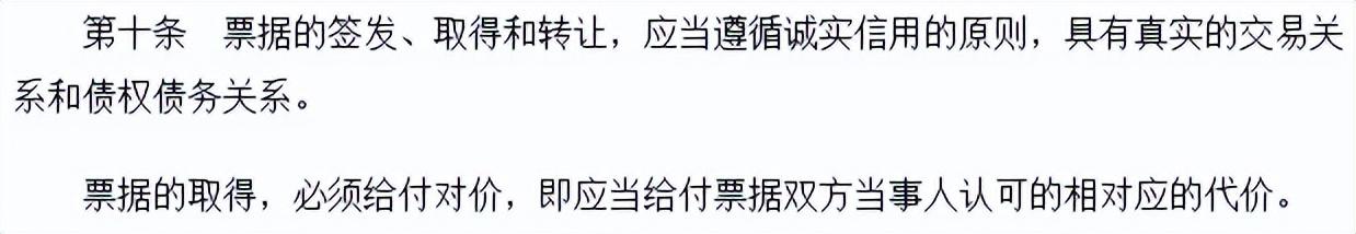 那么第10条是什么规定呢?票据的取得必须给付对价。这条规定就是在说票据的债务人也即是背书人还有出票人,他与票据的背书必须有真实的贸易关系,那么原告没有提供真实的贸易关系来进行抗辩的时候,法院是不会支持的。这也就说明了原告也没有举证证明票据来源的这样一个义务