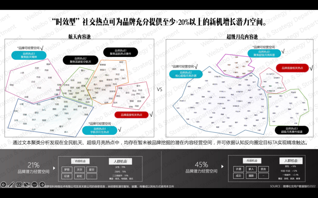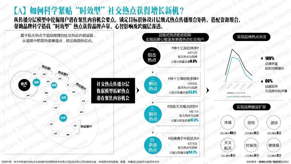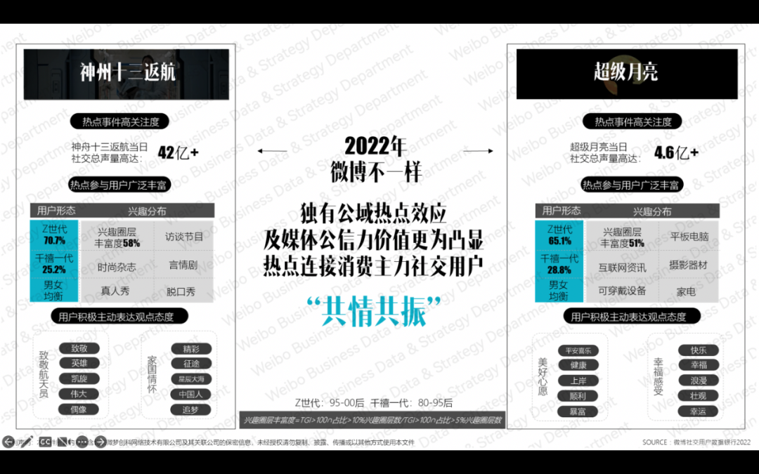 以“神舟十三返航”和“超级月亮”为例,两个热点事件背后,能够看到消费者的变化:年轻的用户,尤其是Z时代的用户参与度极高;热点事件的关注用户,兴趣圈层也呈现出更加丰富的特性。2022 年,整体来看微博公域上的热点,媒体的公信力的价值会更加的凸显,并且热点连接着消费主力社交用户产生“共情共振”的表现。