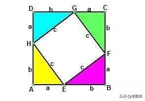 以a、b为直角边(b>a),以c为斜边作四个全等的直角三角形,则每个直角三角形的面积等于二分之一ab。把这四个直角三角形拼成如图所示形状。
